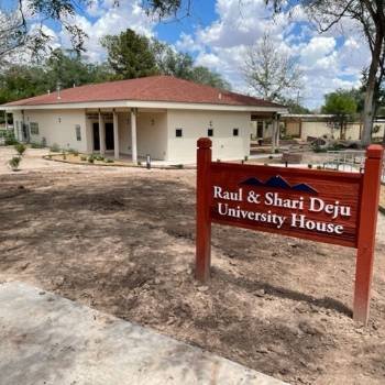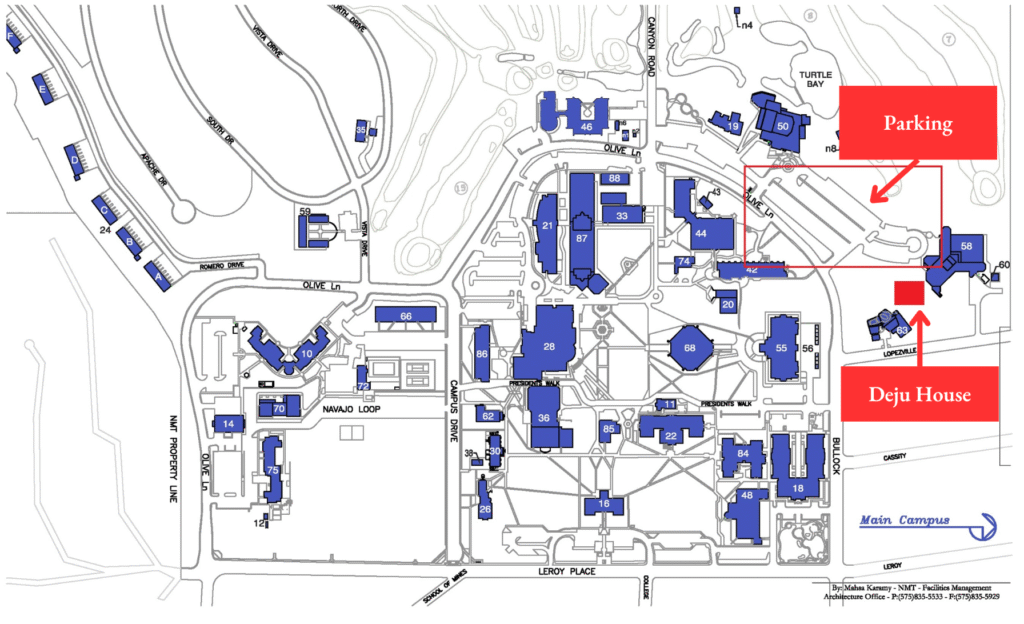 The Deju University House is located on the north side of NMT campus and there is parking in the nearby Macey Center lot. It features indoor and outdoor dining and gathering spaces.